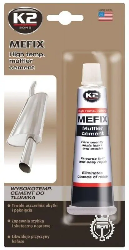 K2 MEFIX je vysokoteplotný cement určený na montáž a opravy nových aj starých systémov, výfukových potrubí, katalyzátorov. Utesňuje diery a praskliny. Ošetrený vysokou teplotou stvrdne ako oceľ. Jednoducho sa rozotiera. Po vytvrdnutí sa nezmršťuje a nerozpadá, vodeodolný.