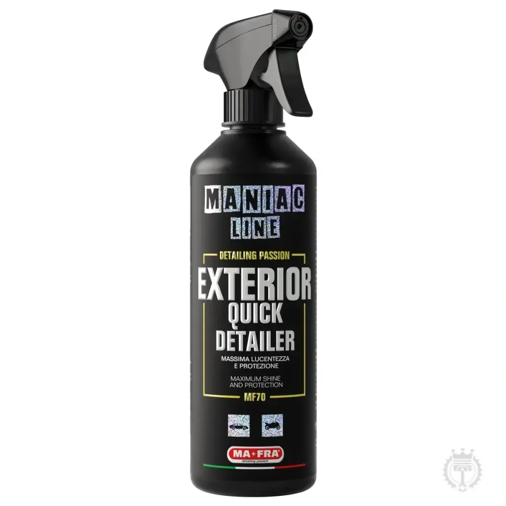 Stalo sa vám to niekedy? Niekoľko hodín po dokonalom umytí príde náhly lejak alebo jednoducho prejdete cez kaluž! Alebo ako nepríjemné je nájsť odtlačky prstov na karosérii a sklách, keď sa napríklad vraciate k autu na parkovisku? Práve tu prichádza na rad "MANIAC - Detailer - Exteriér". Výrobok je koncentrovaný a nezanecháva šmuhy na žiadnom materiáli. Má schopnosť uvoľňovať nečistoty a je vysoko lubrikovaný, aby zabezpečil väčšiu bezpečnosť pri aplikácii. Môže sa používať na mokré alebo suché povrchy.